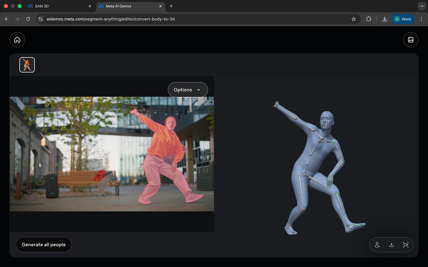 Some of the other demos feel early. Video tracking can break when objects move fast. Audio separation works only in simple cases and with precise prompts. The body-to-3D demo gives you a generic result that’s far from realistic.