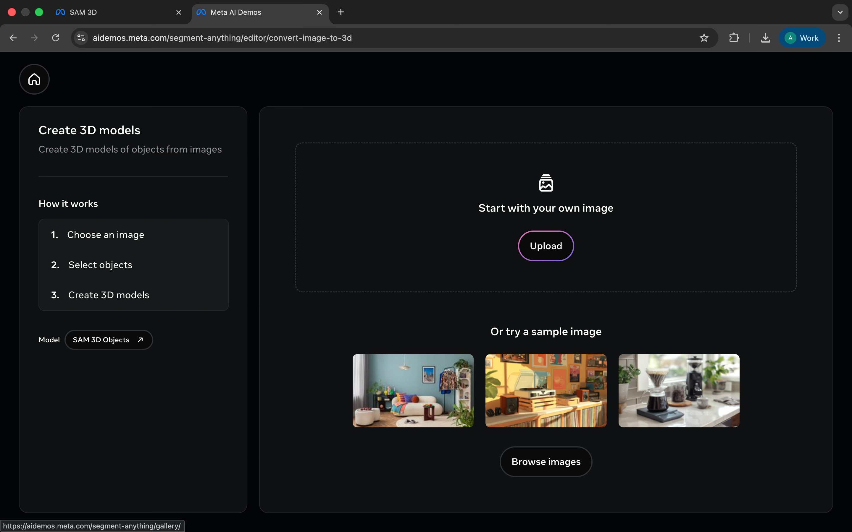 I tried SAM 3D through Meta’s Segment Anything demos, starting with images and then exploring the other tools in the gallery.