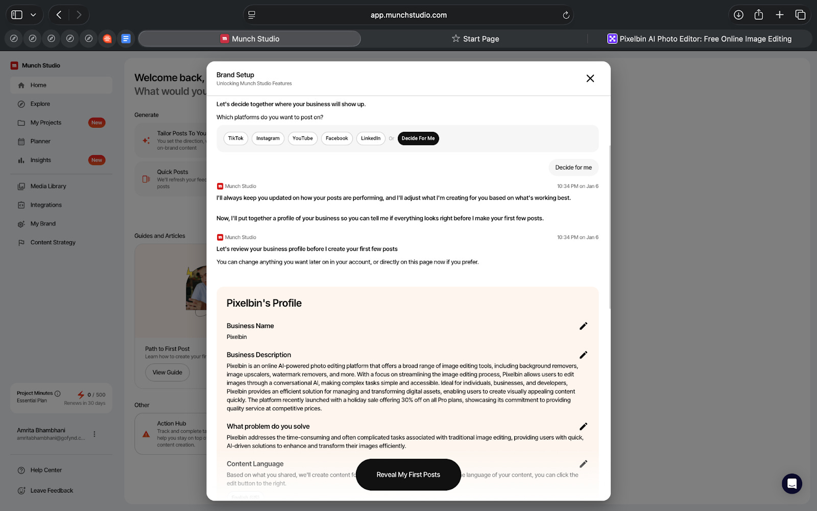 Munch is essentially an AI tool that takes your brand, your website, and your inputs, and then turns that into a full social media setup. It decides the platforms, creates a content strategy, plans the week, generates posts and videos, and schedules them. You can guide it but the default behaviour is that the system keeps moving without waiting for you to decide each step.