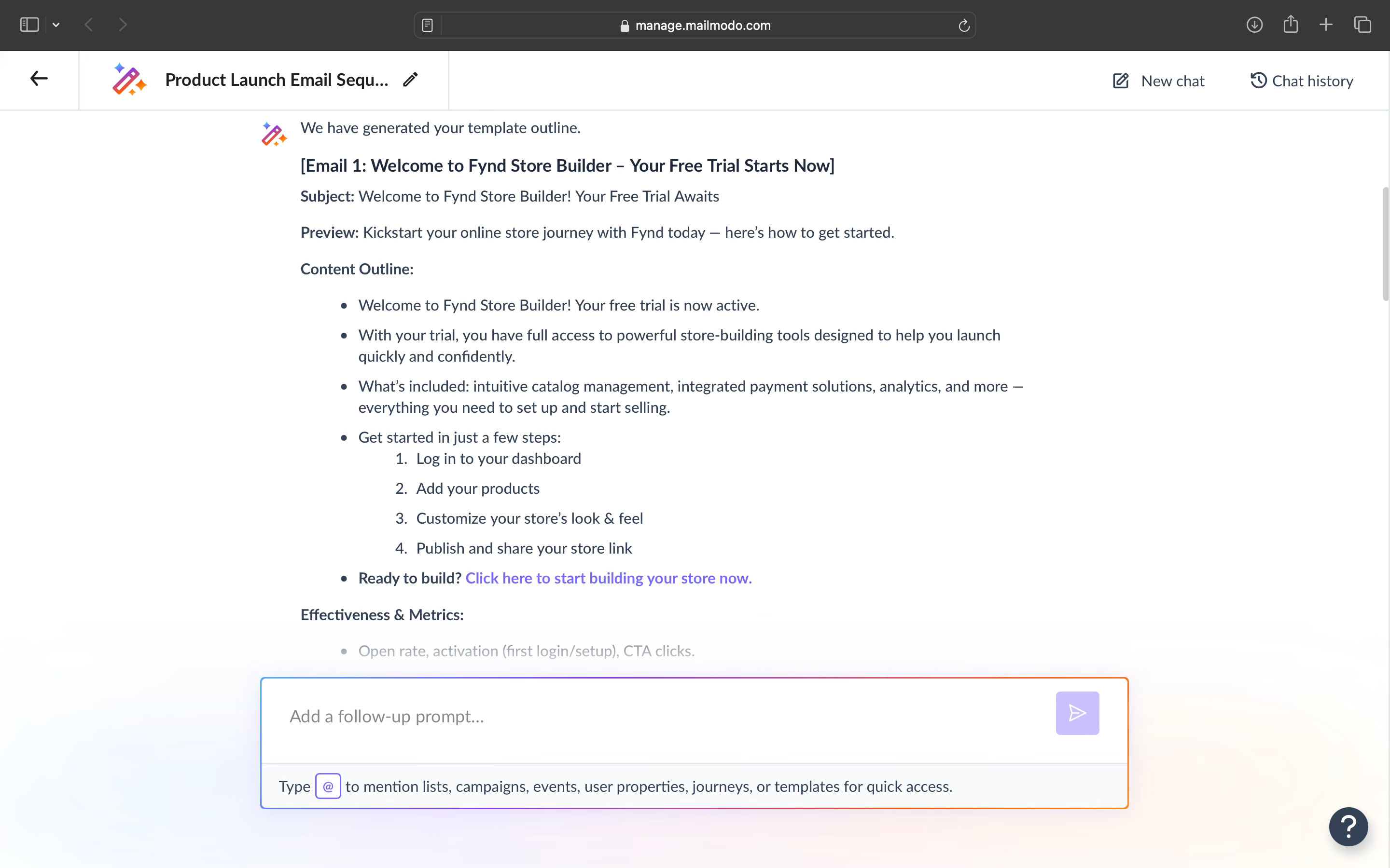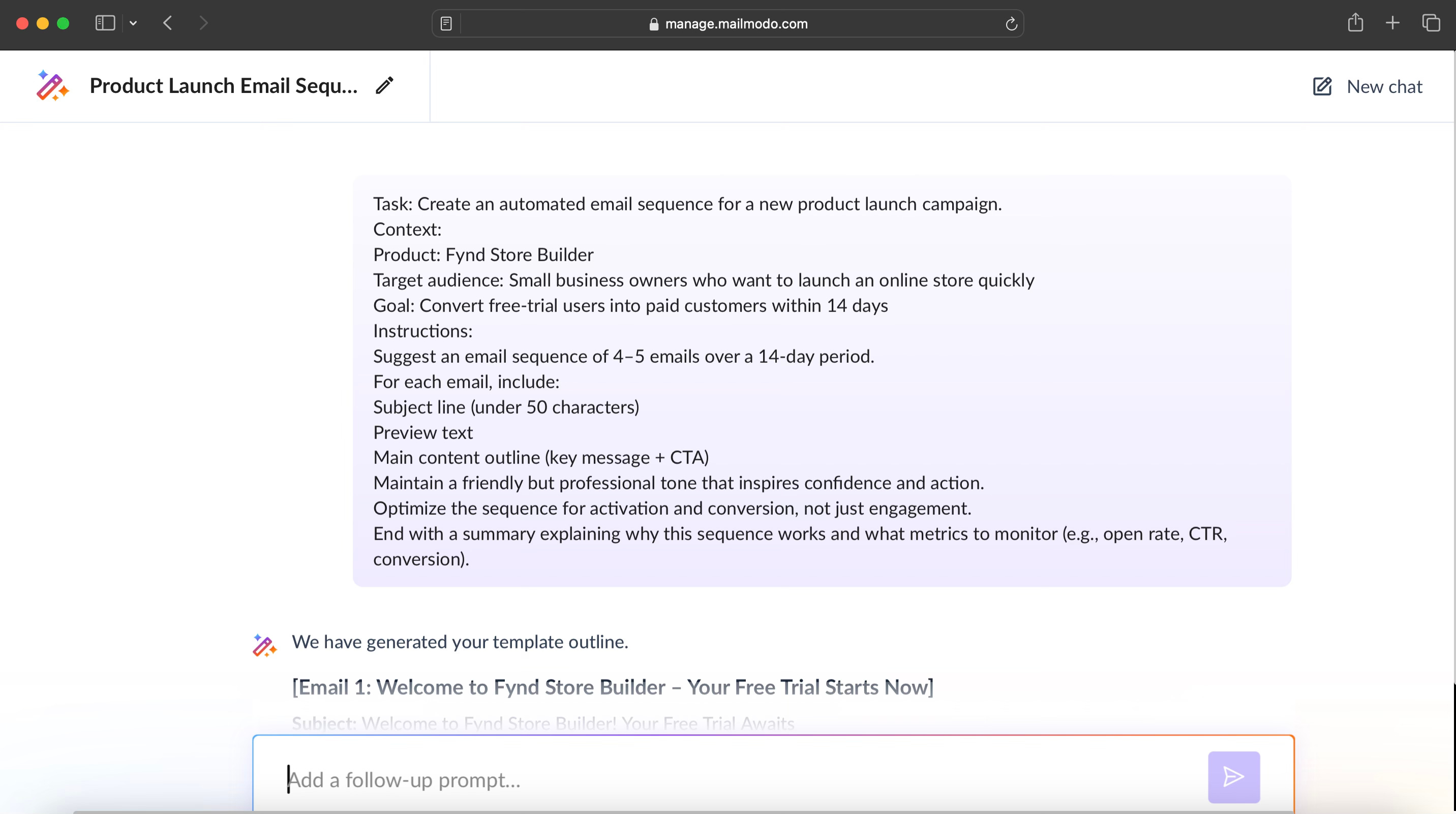 I gave it a simple prompt: “Create a 5-email launch sequence for Fynd Store Builder targeting small business owners on a 14-day trial.” Within seconds, it drafted a completed sequence, from welcome to feedback, with subject lines, preview text, CTAs, and performance metrics.