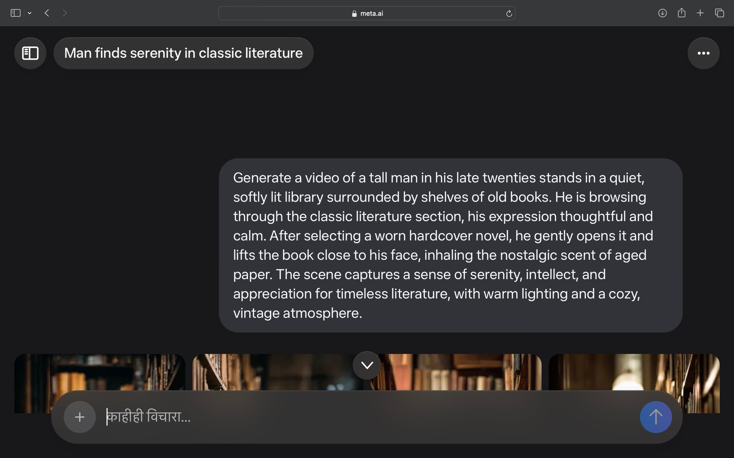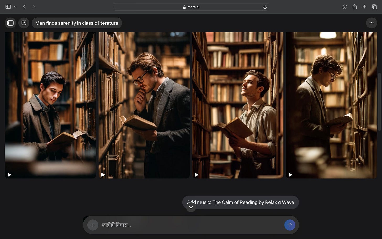 I tried it with a scene prompt: “A tall man in his late twenties stands in a softly lit library surrounded by old books.” The goal was to test whether Vibes could capture the atmosphere rather than just generate motion.