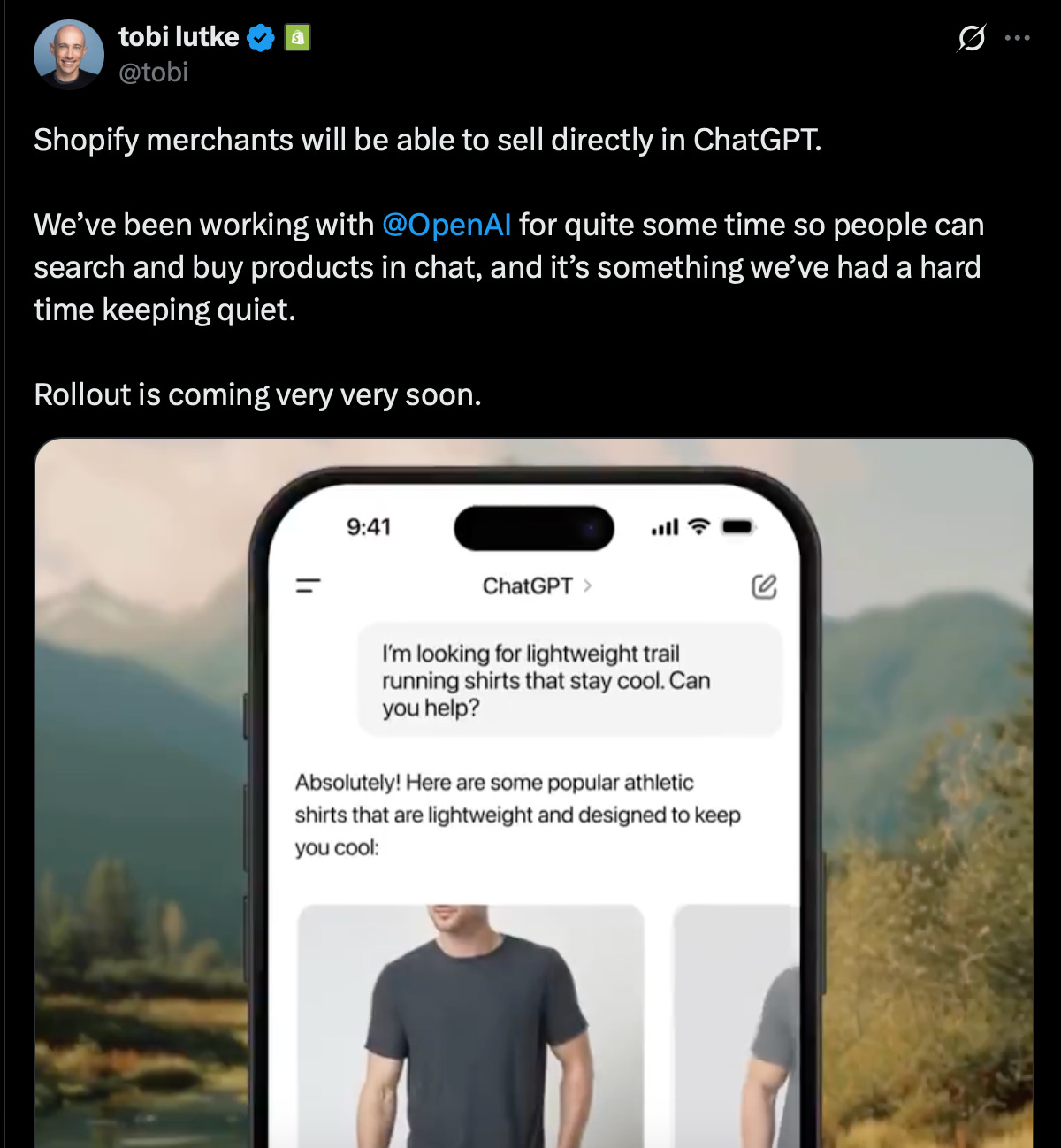 Shopify has partnered with OpenAI to let merchants sell directly inside ChatGPT, creating what might be the first real version of conversational commerce at scale. The idea is that when a user asks ChatGPT for product recommendations, it can now show live product listing from Shopify merchants, complete with price, images, and checkout options, without opening a new tab or visiting a website.