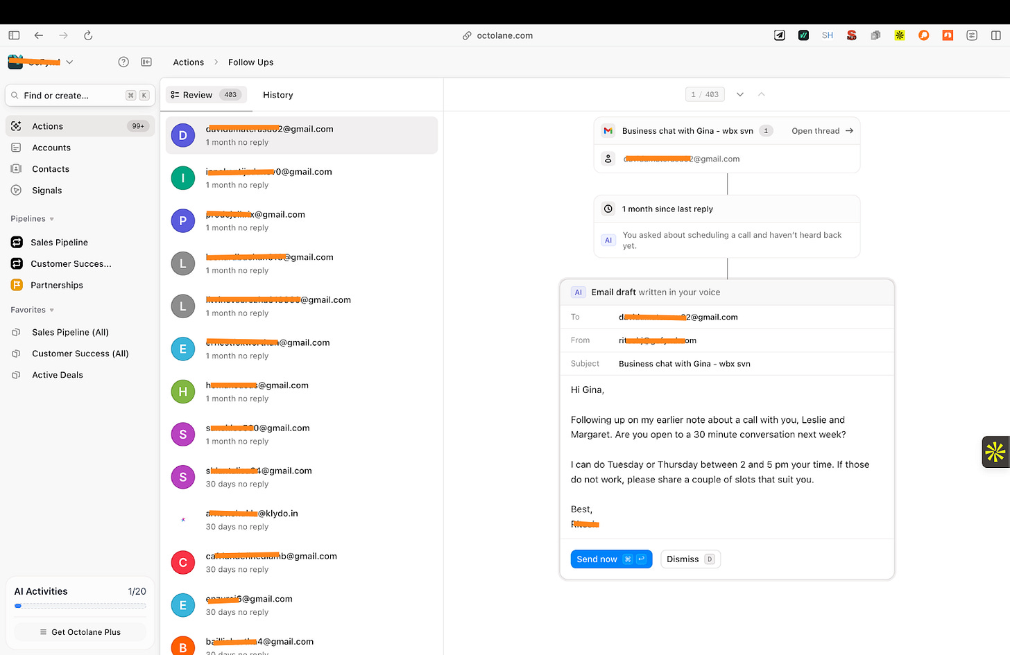 The email drafts also stood out. Octolane picked up context from past conversations and wrote follow-up emails based on what had already been discussed. I only needed to review the draft once before sending it directly from the tool.