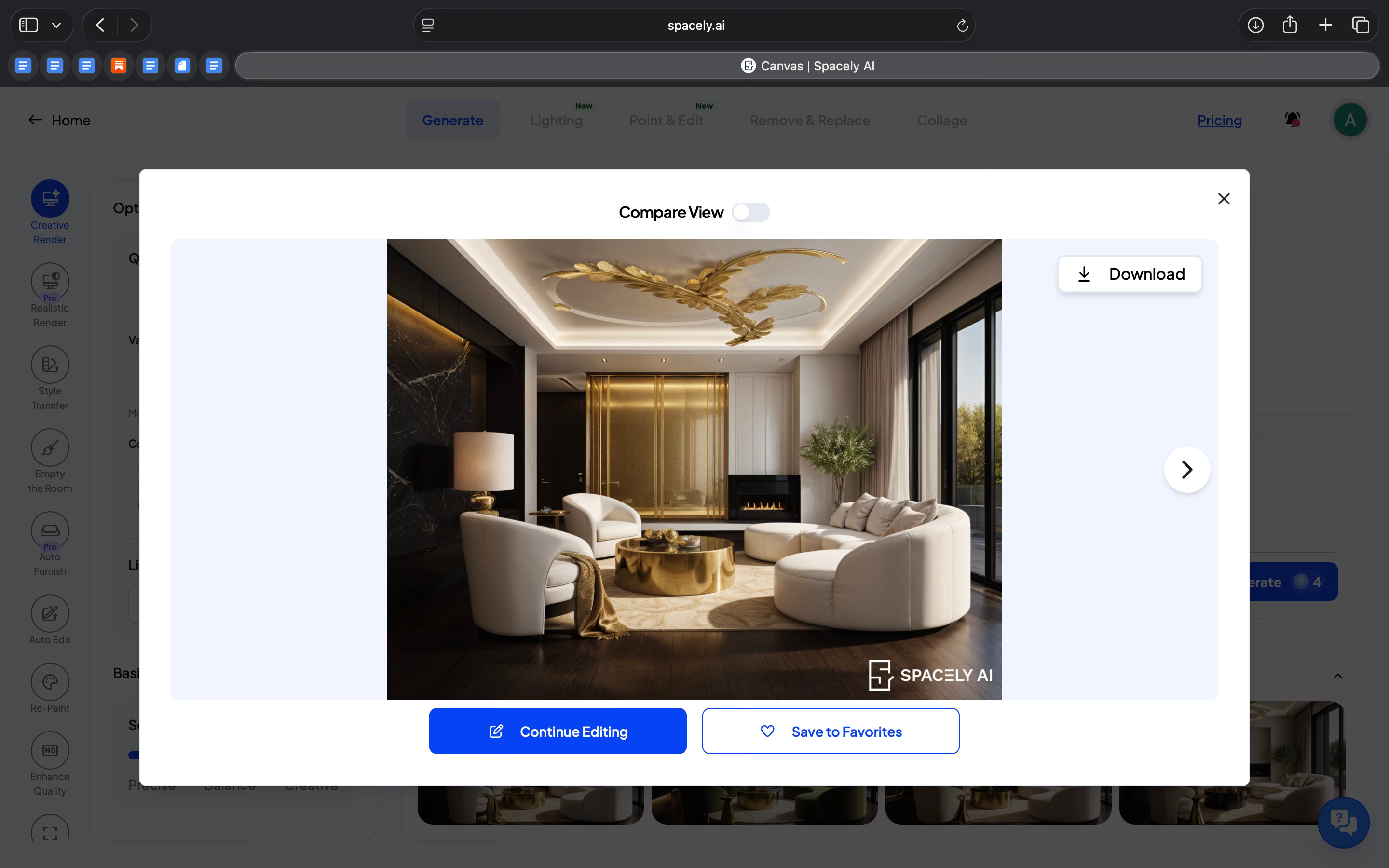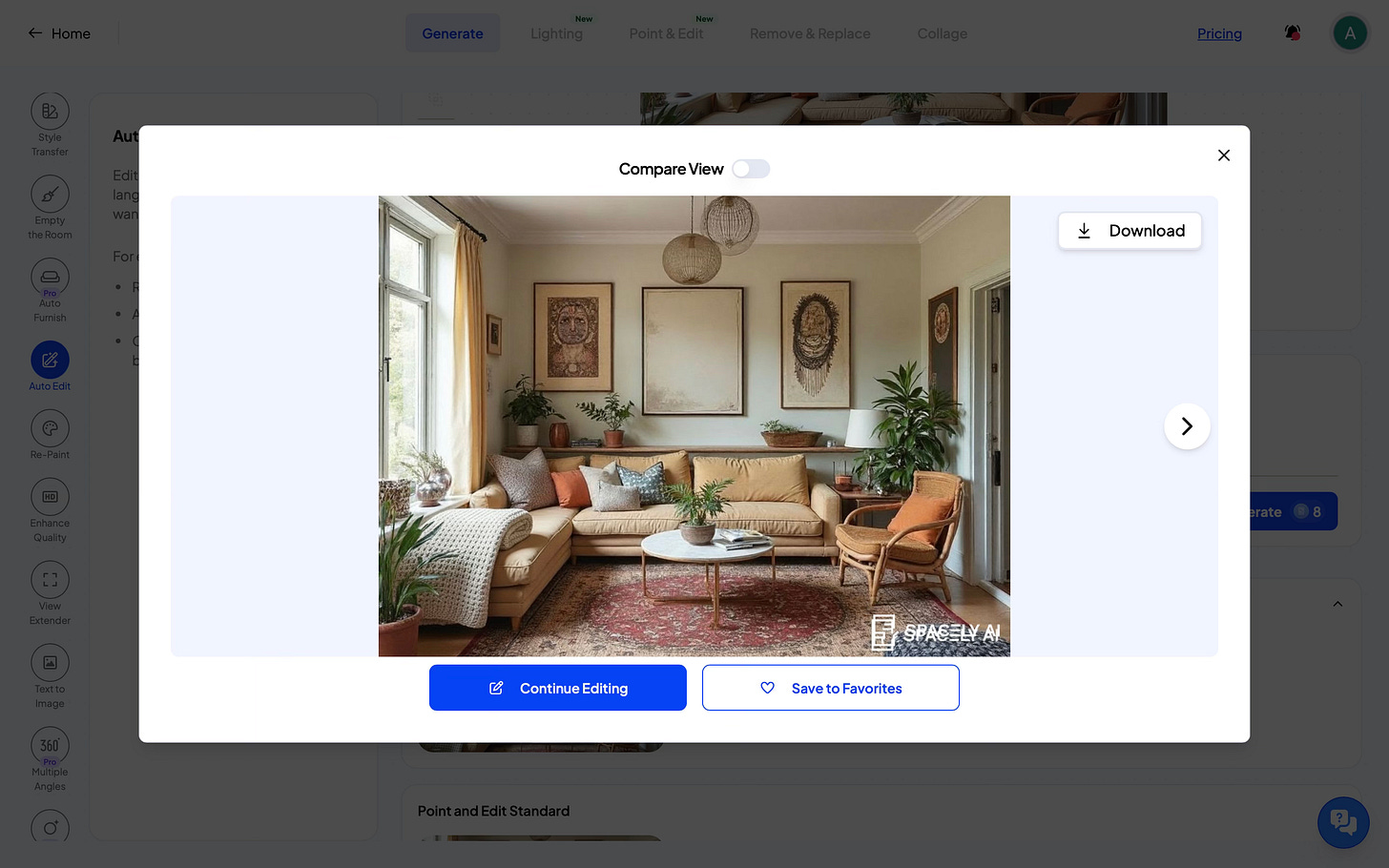 In my experience with Spacely, the ability to make targeted edits using Point & Edit, Auto Edit, or Remove & Replace without disturbing the rest of the room is something prompt-only tools don’t offer.