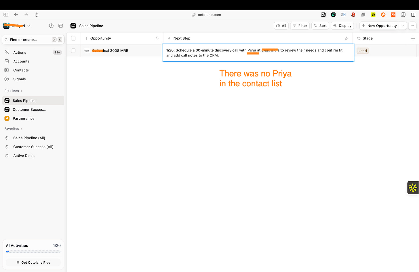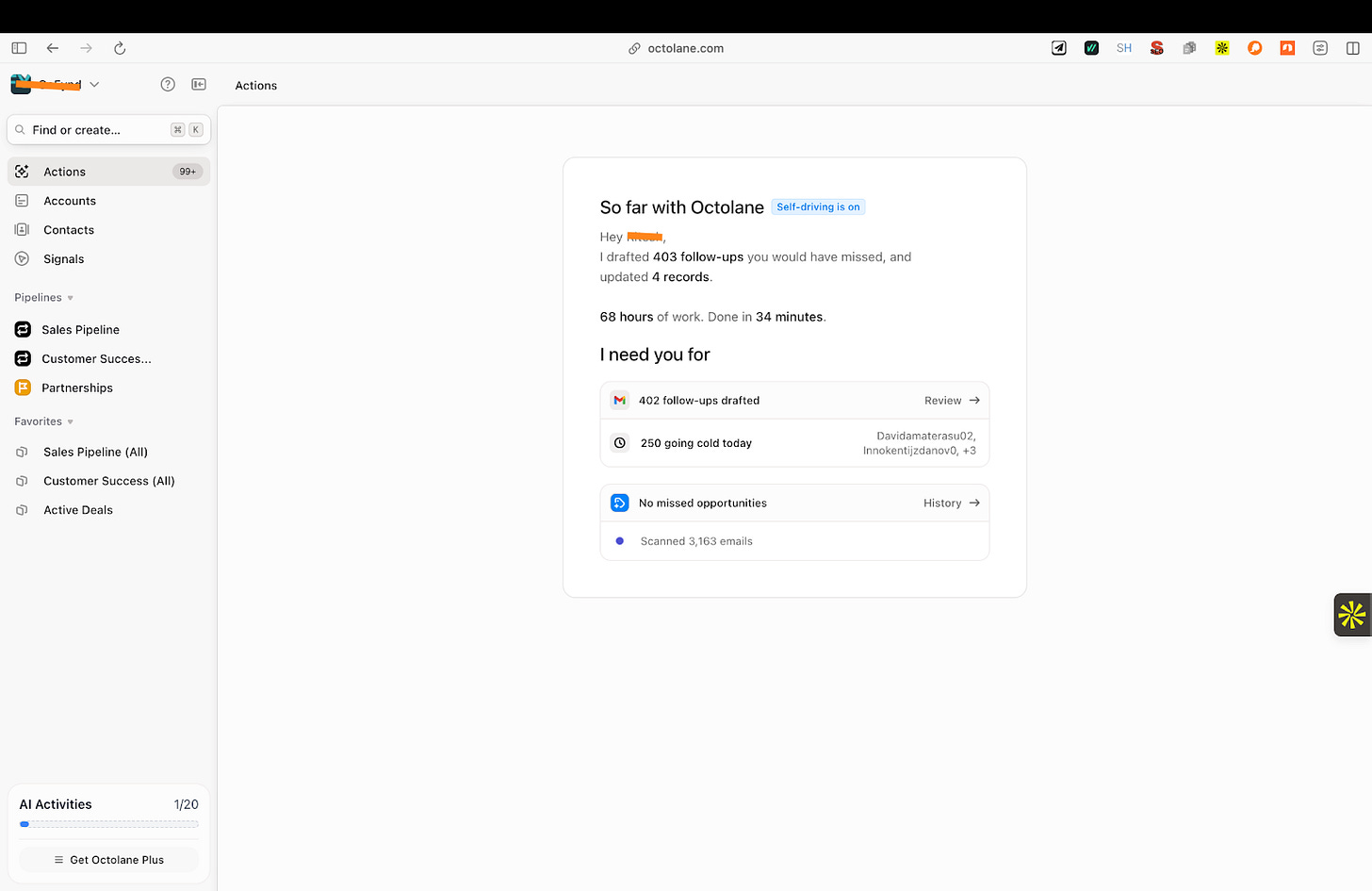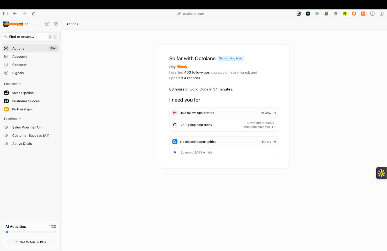 What I found interesting about Octolane is that instead of opening on a dashboard, it used my login to analyze my emails and calendar and understand the deals I was already working on.