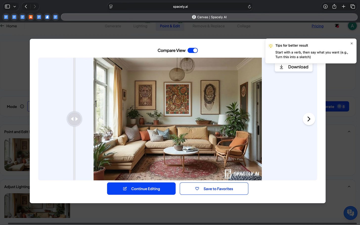 Across all these features, the AI is embedded into specific actions instead of acting like a chatbot. The tool guides you on how to write prompts, limits the scope of changes, and keeps edits focused. What stood out to me is that Spacely lets you work in small steps, change one thing at a time, and keep refining the same space instead of committing to a final image early.