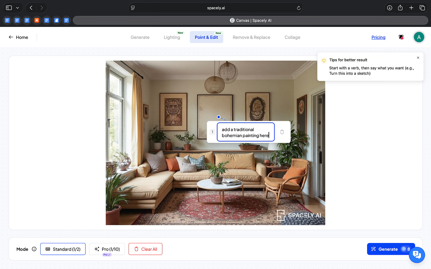 I started by working on an existing interior rather than generating a new image from scratch. From there, I could make very specific changes. Using Point & Edit, I clicked on a particular area of the image and added a traditional bohemian painting to the room. The painting appeared exactly where I clicked, and the rest of the space stayed the same.
