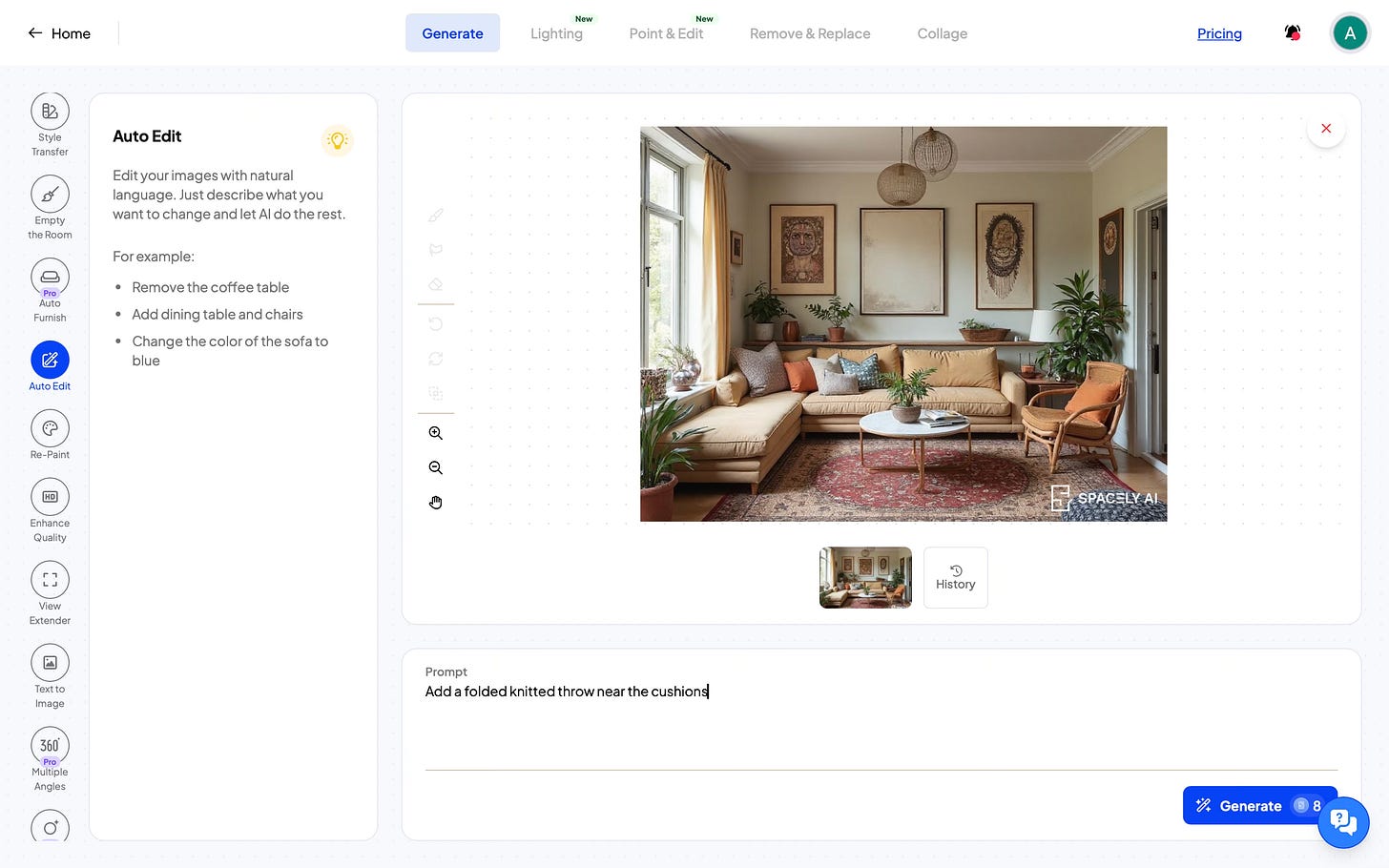 For object-level changes, I used Auto Edit and Remove & Replace. With Auto Edit, I could describe a change in simple language, like adding a folded knitted throw near the cushions, and the tool applied that change to the image. With Remove & Replace, I could remove an existing object or replace it with something else. In both cases, the changes were limited to that object and didn’t affect the rest of the design of the room.