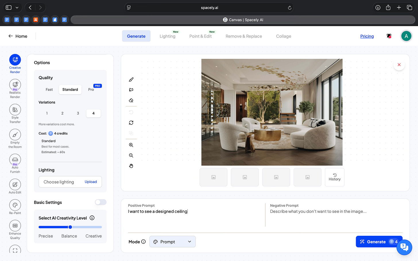 Spacely also lets you work on architectural elements like the ceiling. I could design and modify the ceiling independently. That kind of control is usually hard to get in AI-based interior tools.