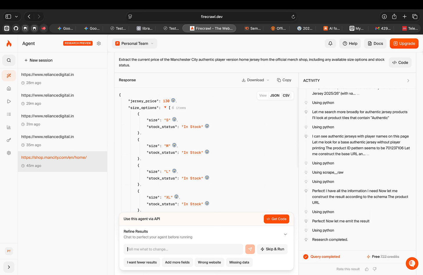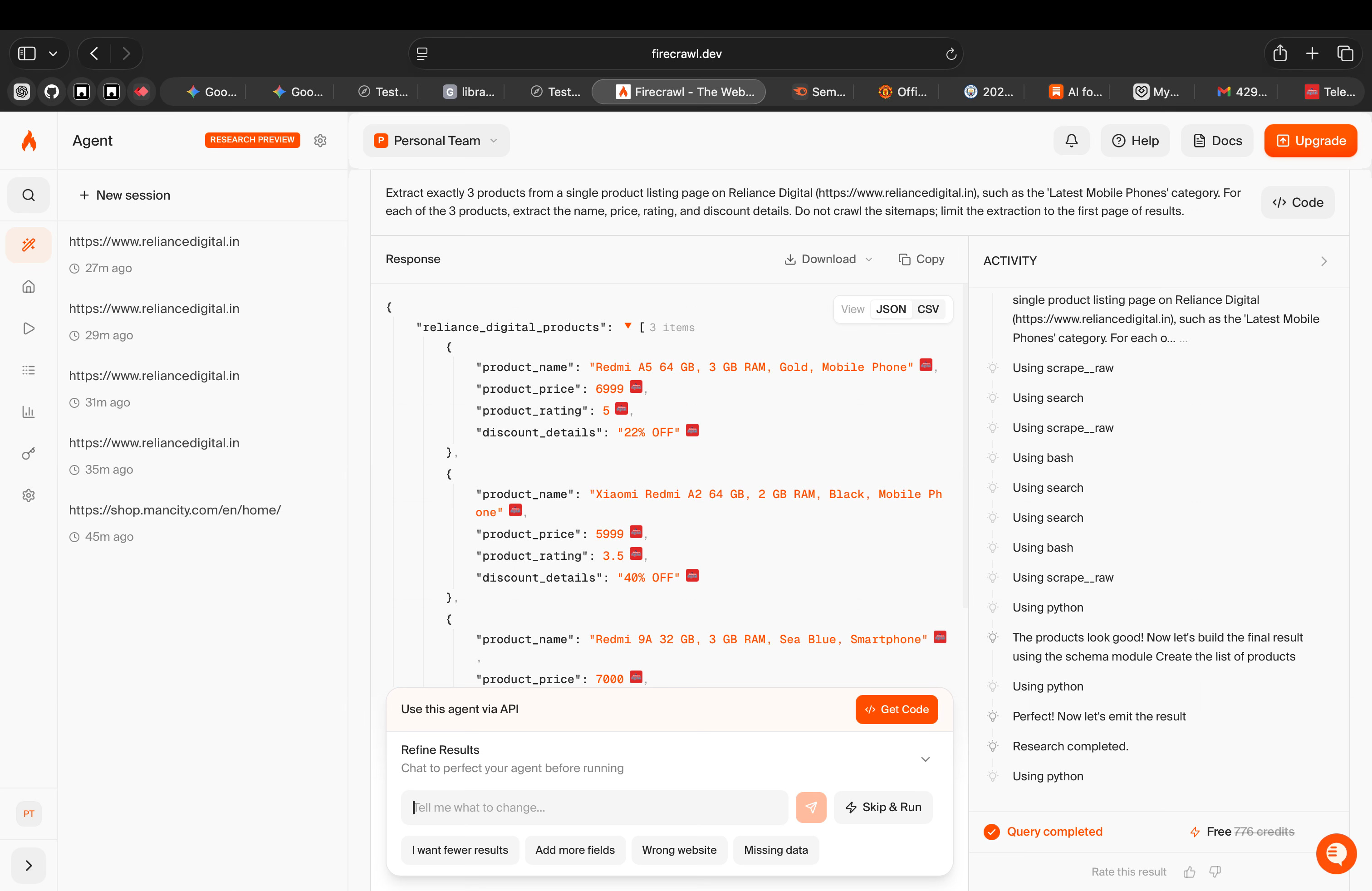 When I ran it on the Reliance Digital website, it didn’t assume what I wanted. It asked clarifying questions, let me define the structure, and then worked toward producing data in that shape. The interaction felt more like configuring a task than writing scraping logic.