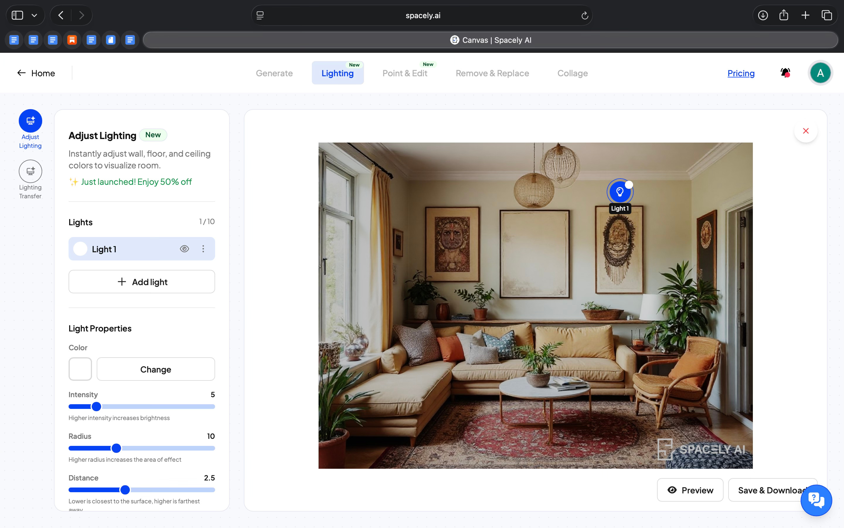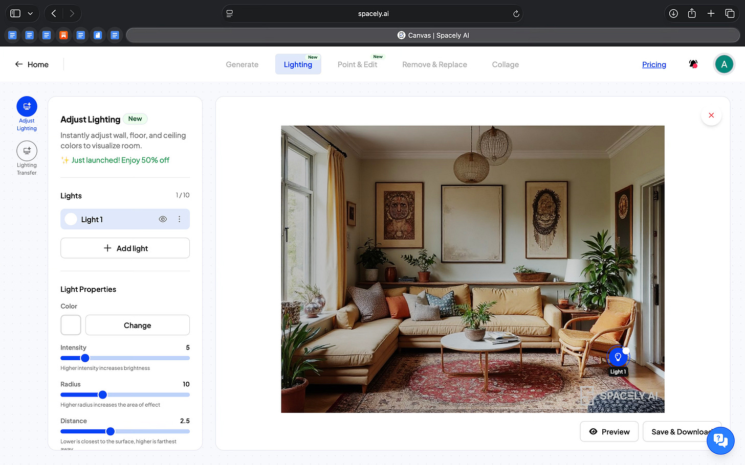 What’s more was I could control the lighting of the room. Instead of treating lighting as a single style choice, it lets you work with it in detail. I could switch between lighting presets like daylight or evening light, and I could also adjust individual light sources. Each light could be changed by color, intensity, radius, and position. This made it possible to test different moods without changing the layout or materials.