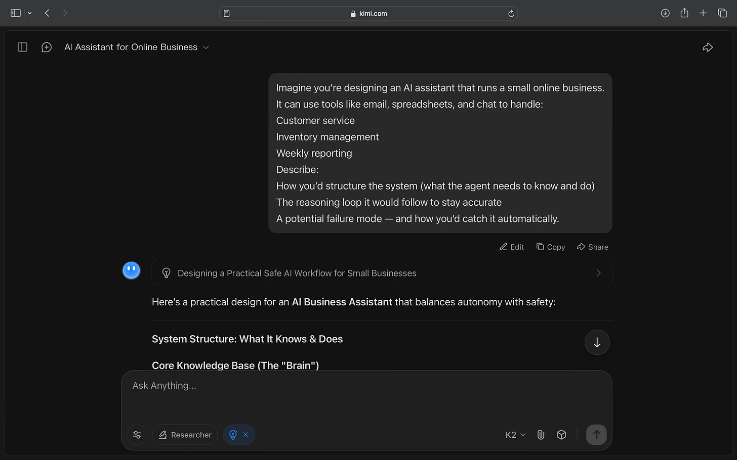 GPT-5 outlined the same system in less detail but more structure. It captured the key principles, delegation, feedback, and human override, without getting lost in its own logic. Kimi’s design was longer, more technical, and at times overengineered. But it was also imaginative, the kind of thinking that hints at potential beyond the surface.