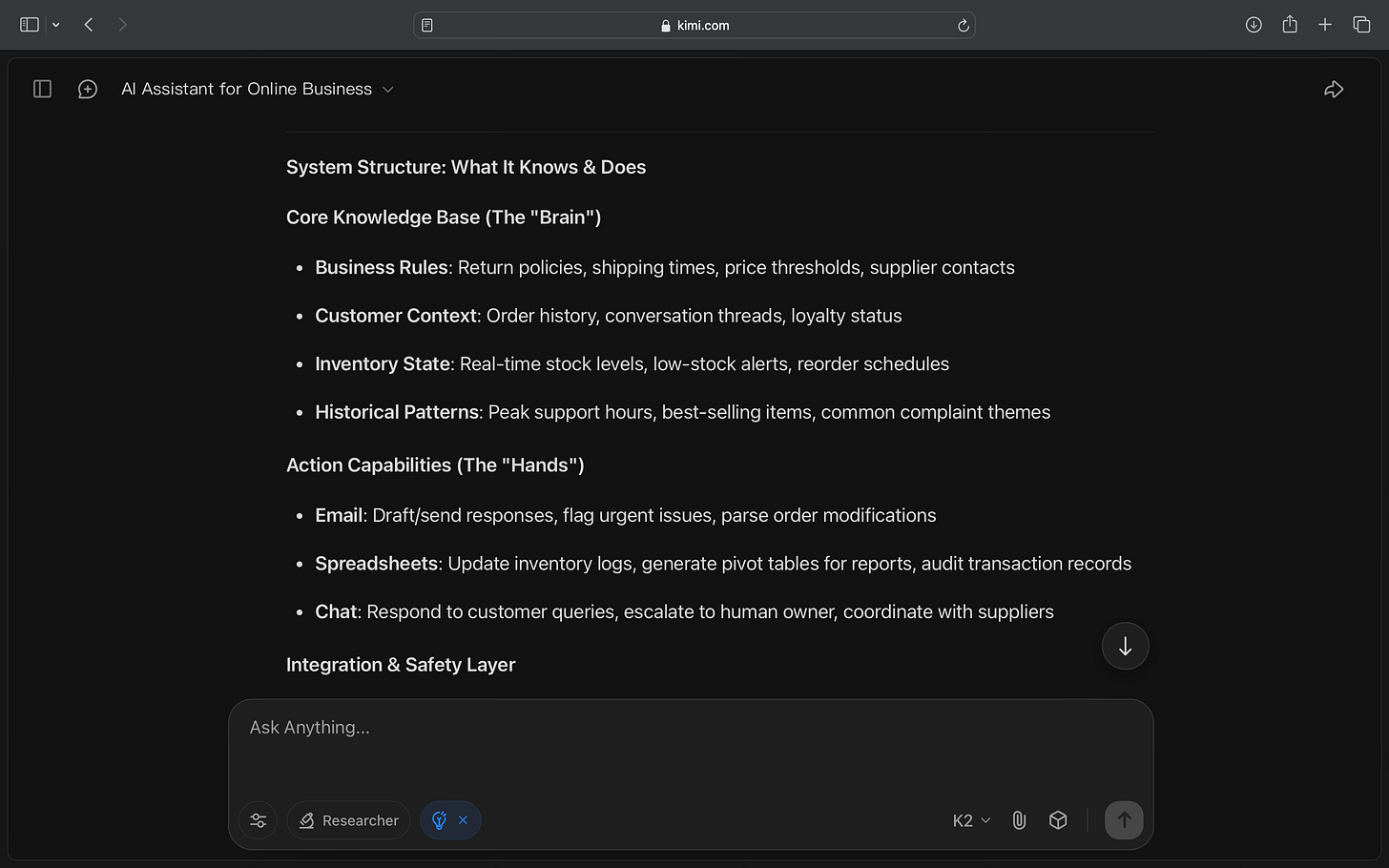 Kimi K2 treated it like a full architecture exercise. It mapped data flow, reasoning loops, and safety mechanisms, even defining a failure mode it called “inventory hallucination.” It described how to detect and recover from it using a triple-check rule.
