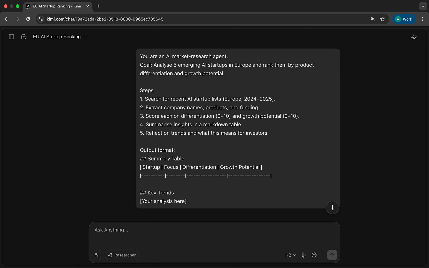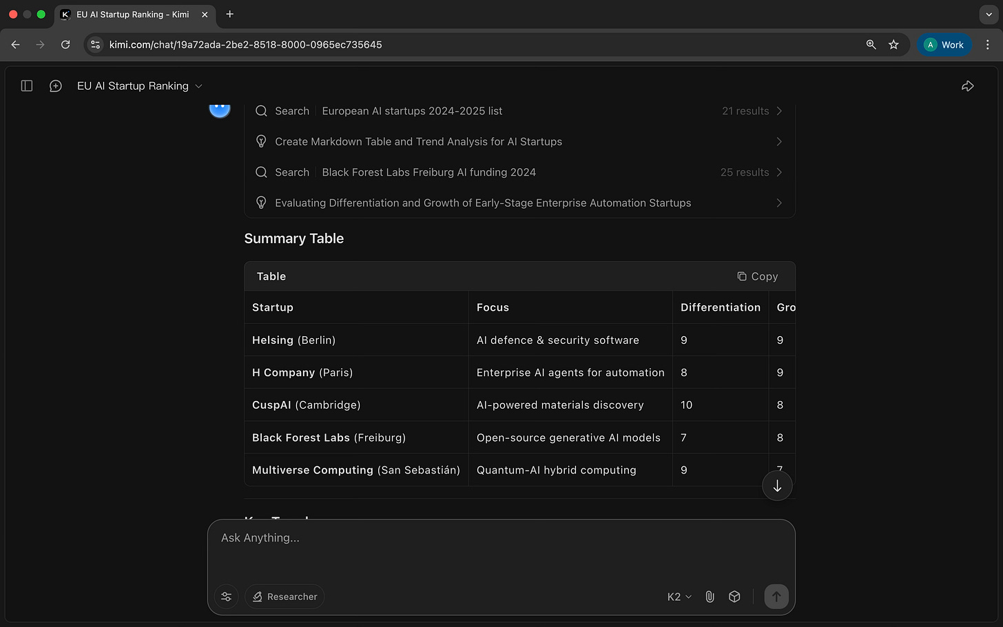 Kimi K2 approached the task like an analyst in training. It produced a ranking, scoring table, and commentary on each company’s market position and funding history. It even cited sources such as EU Startups and Financial Times. The detail was impressive, though not always consistent. A few references were plausible rather than precise.