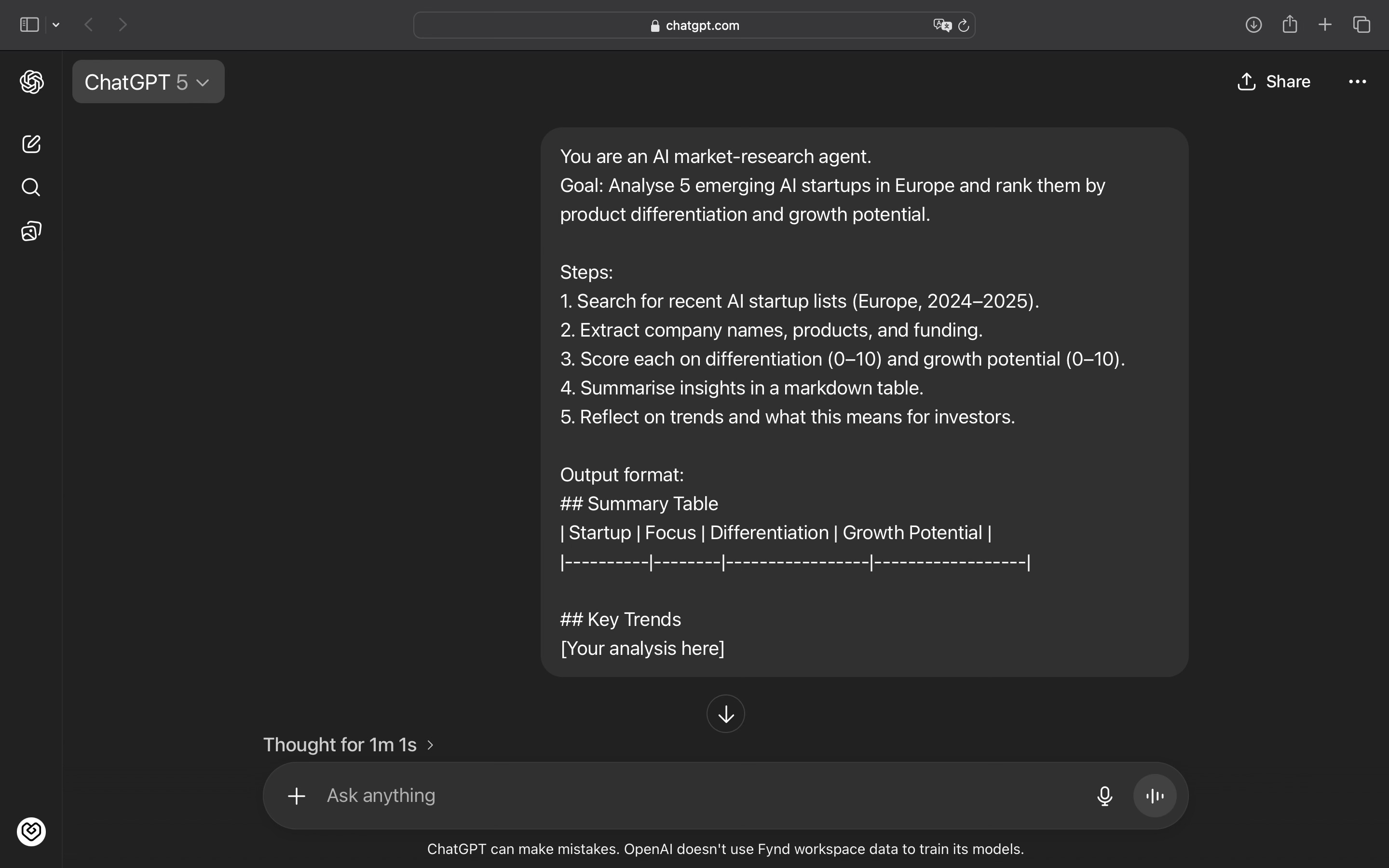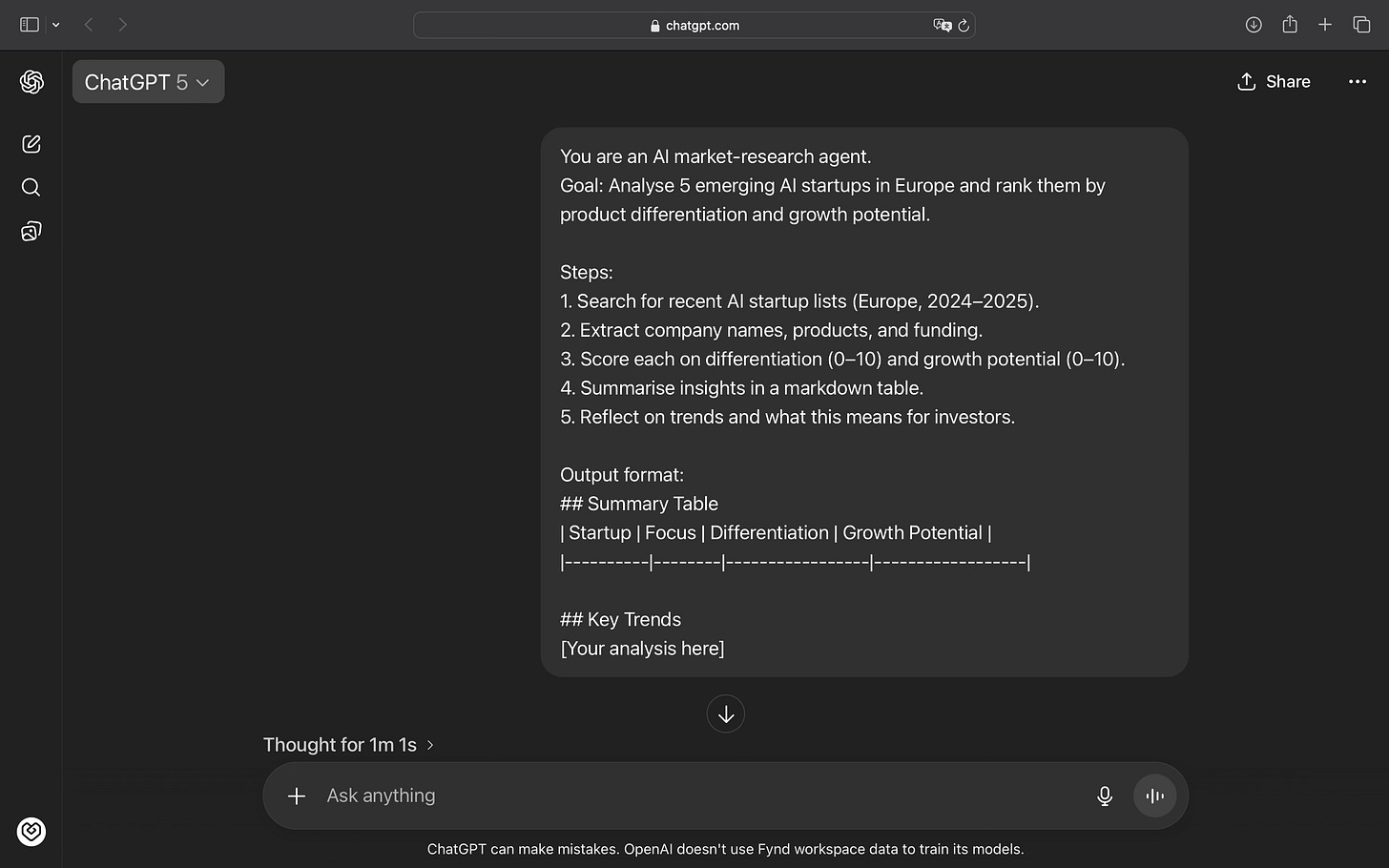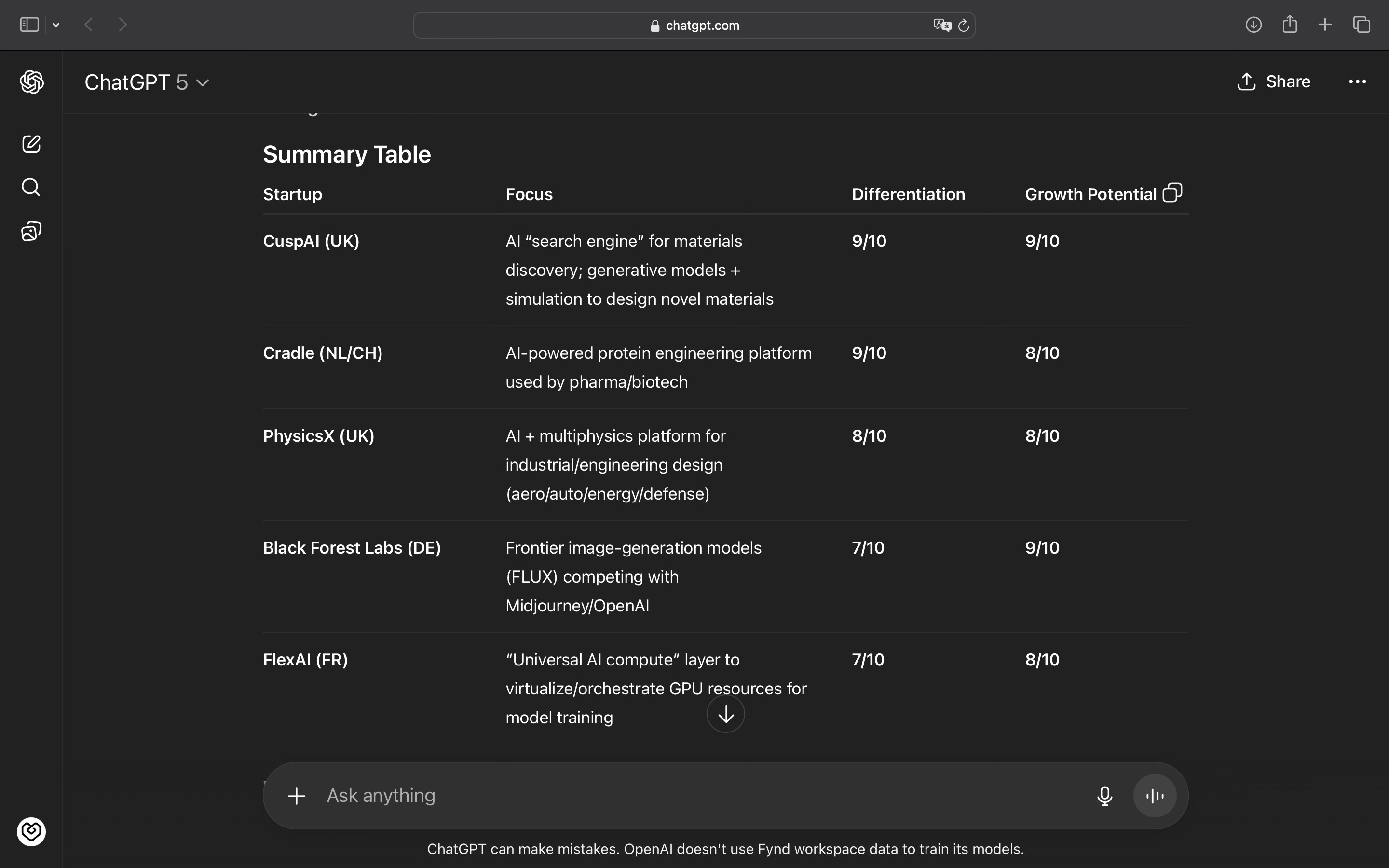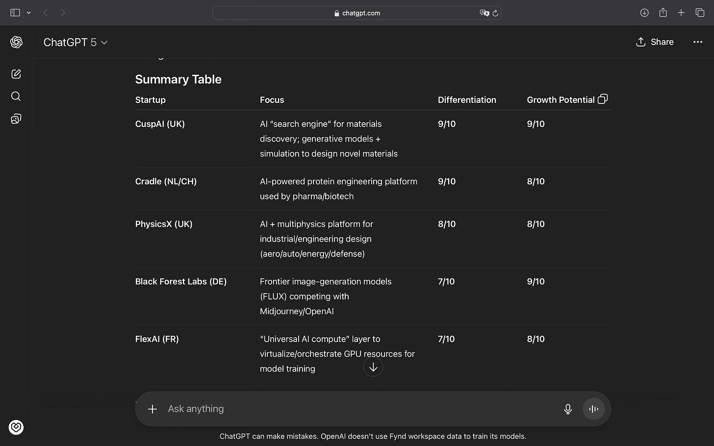 Next, I asked both models to analyse five emerging AI startups in Europe and rank them by differentiation and growth potential.
