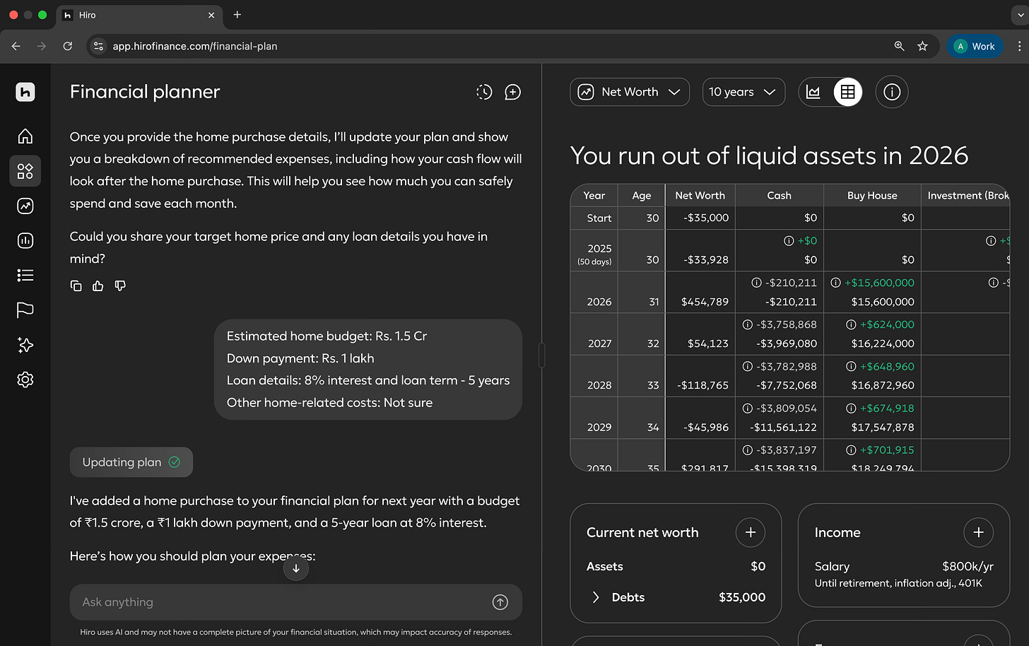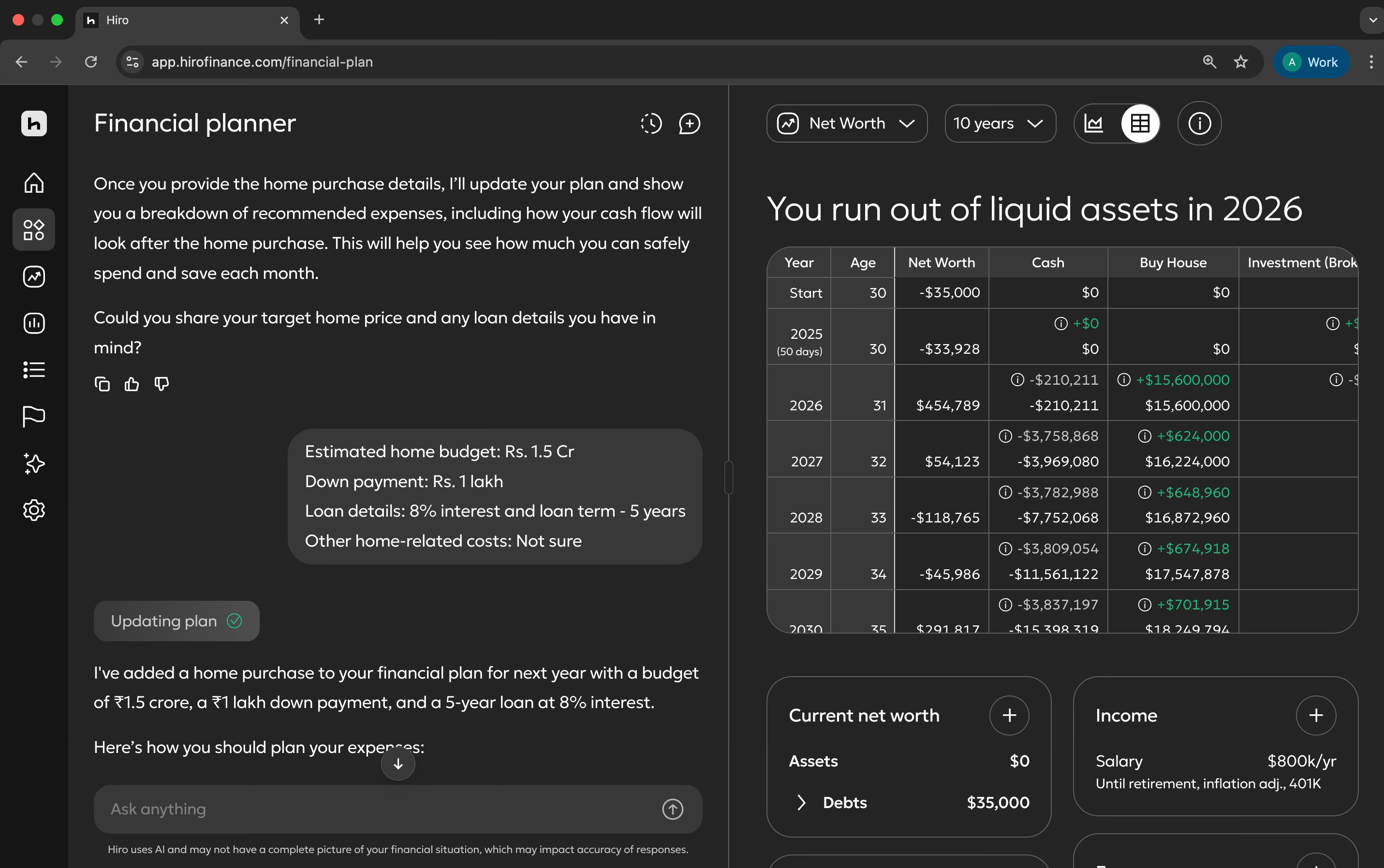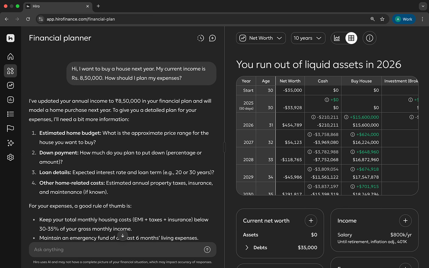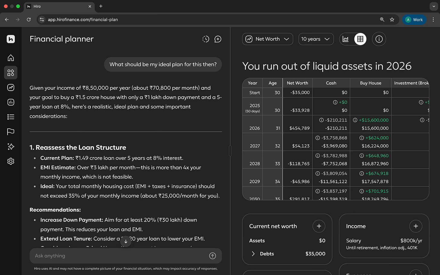 When I tried it, I wanted to see if that promise held up. So I gave it a plan that was intentionally flawed which included a modest income, a big house, a small down payment, and a short loan term. Within seconds, Hiro responded with a projection that said, very plainly, I’d run out of liquid assets by 2026.