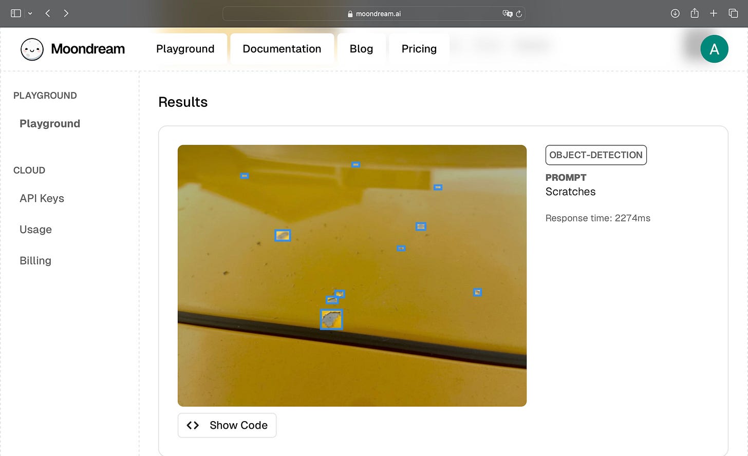 In Detect, I uploaded a photo of a scratched car and prompted “Scratches.” It accurately marked the damaged spots within seconds.