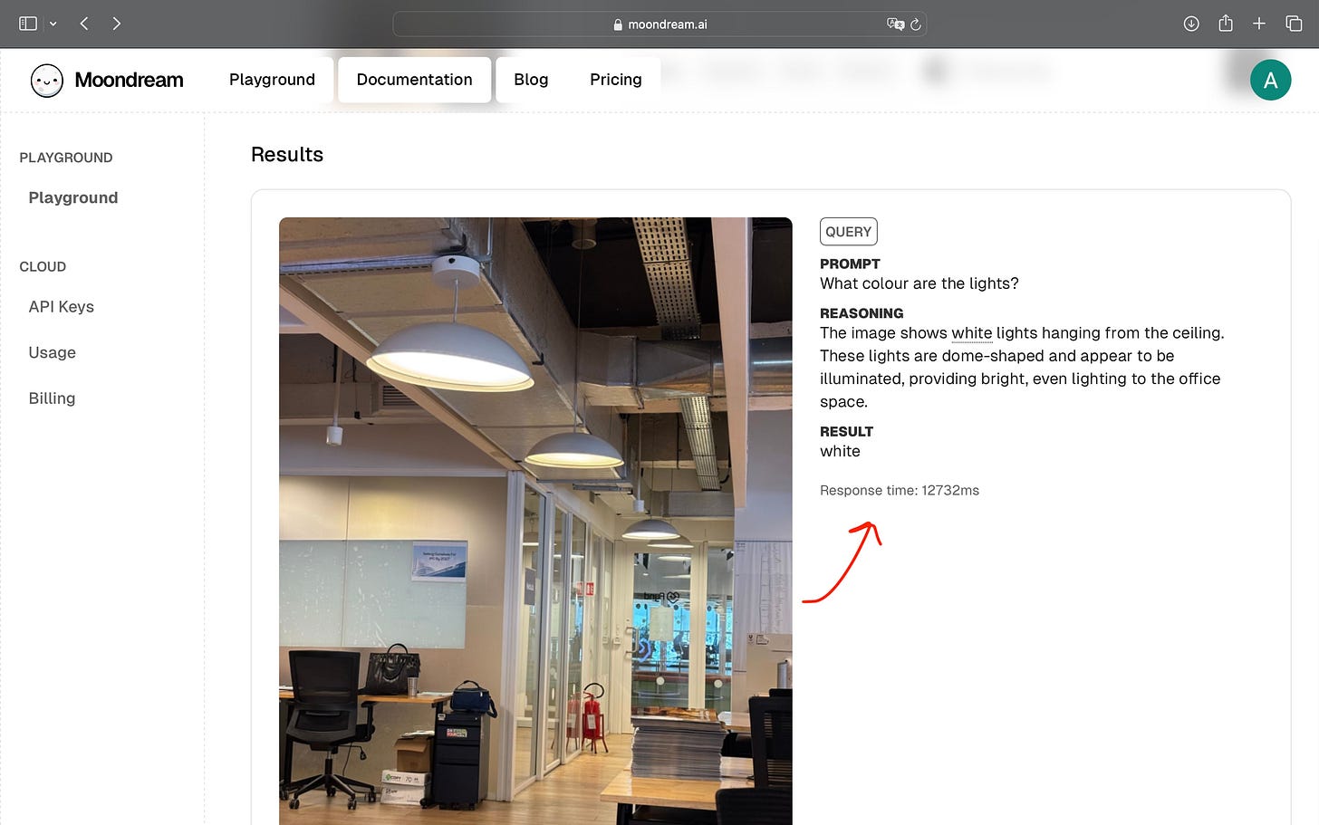 In Query, I uploaded an office image: “What colour are the lights?” The response was short and factual: “White lights hanging from the ceiling… providing even lighting to the office space.”