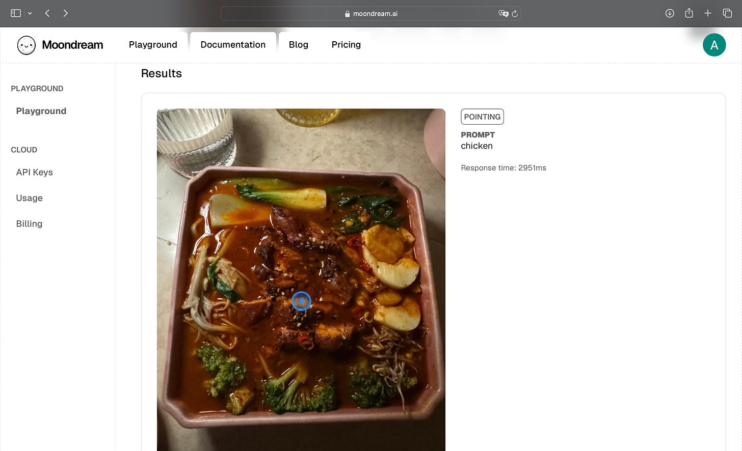 Finally, in Point, I used a ramen bowl’s image and prompted “chicken.” The model pinpointed the correct spot instantly.