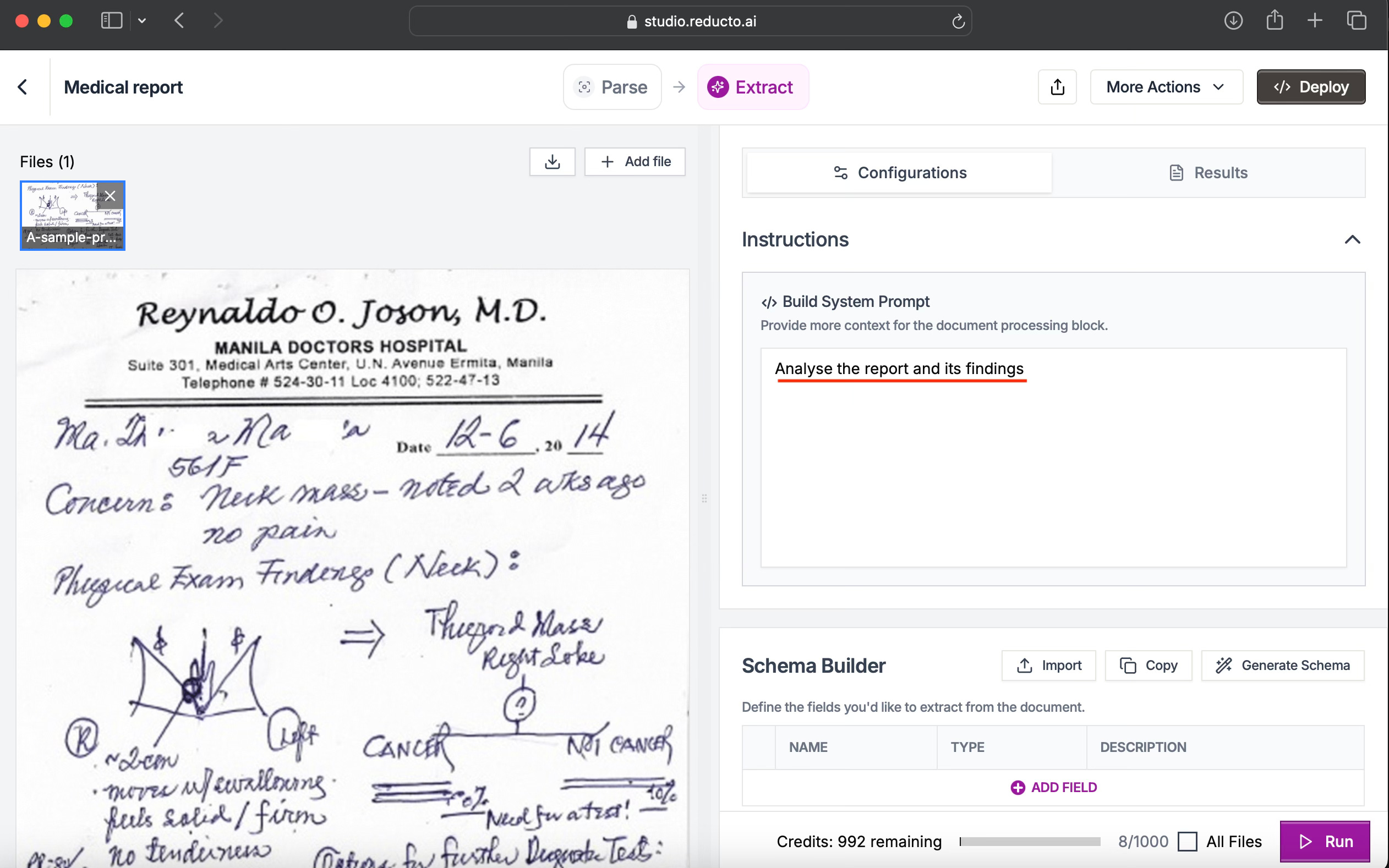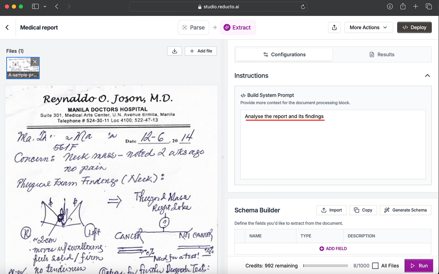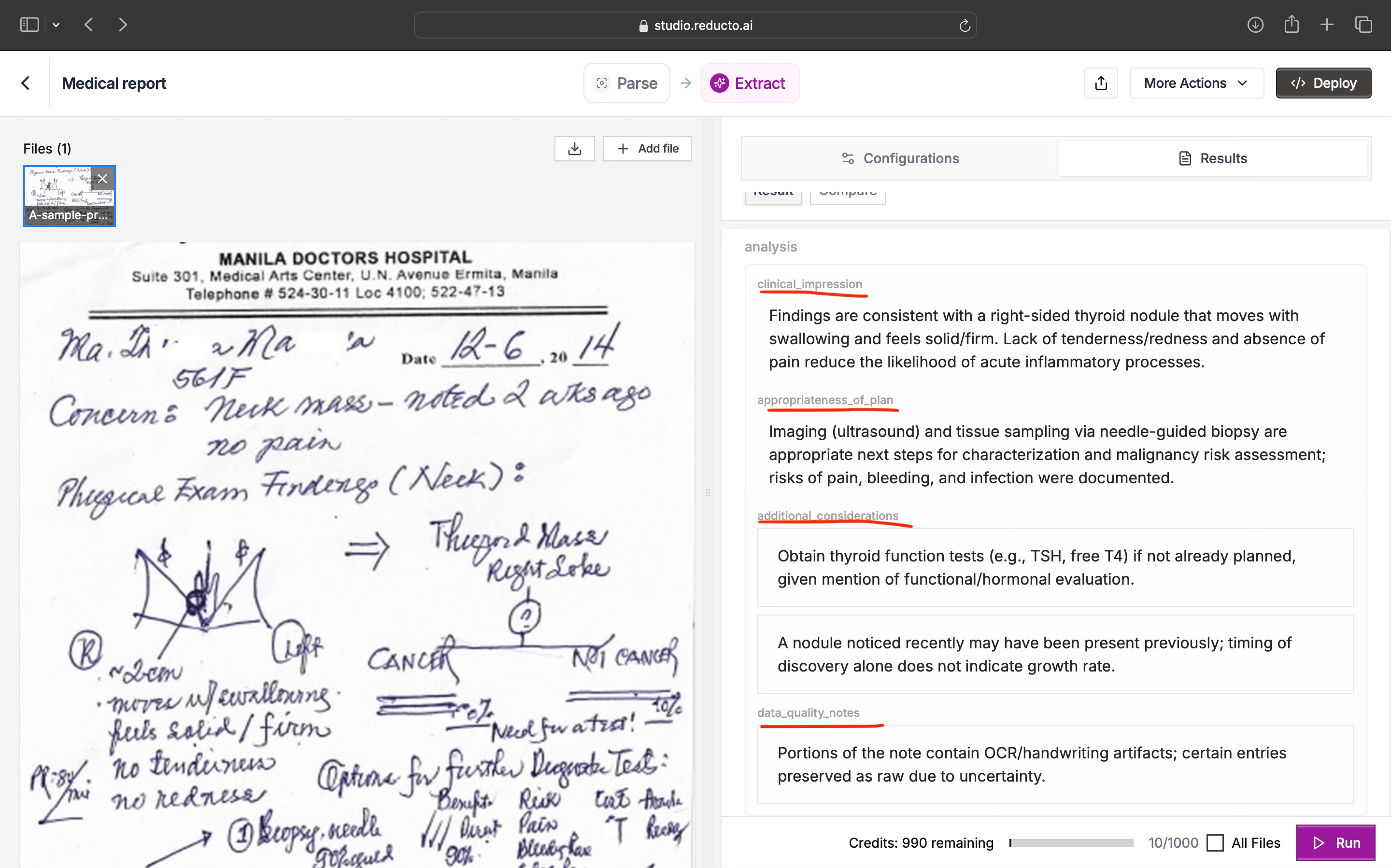 I tested Reducto using a sample scanned, handwritten medical report. In a single Parse → Extract run, the tool recognised layout, preserved formatting, and surfaced key fields such as impression, appropriateness of plan, additional considerations, and data quality notes.