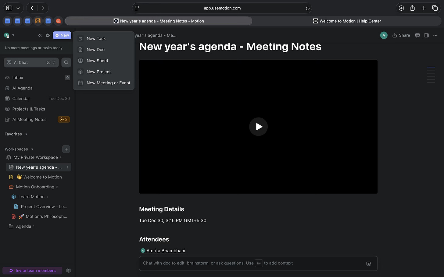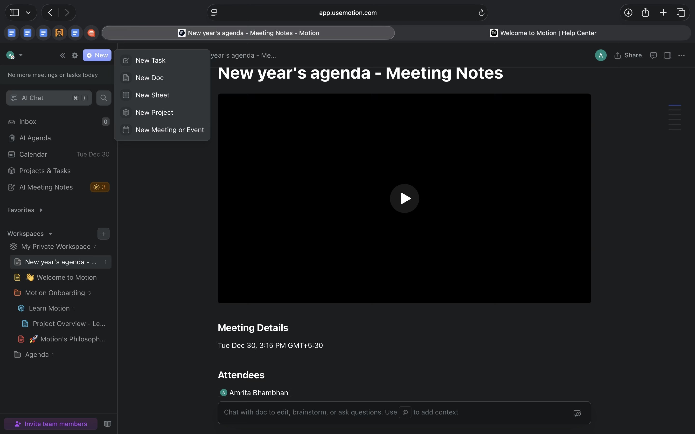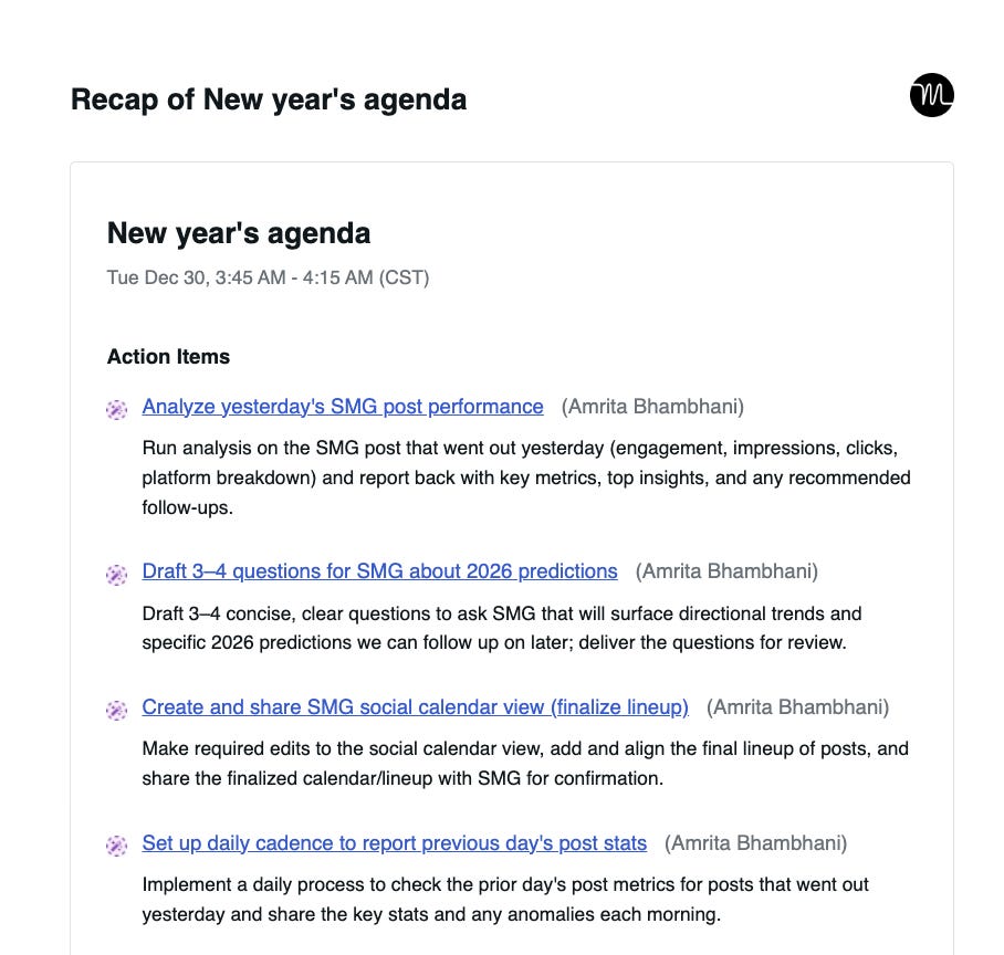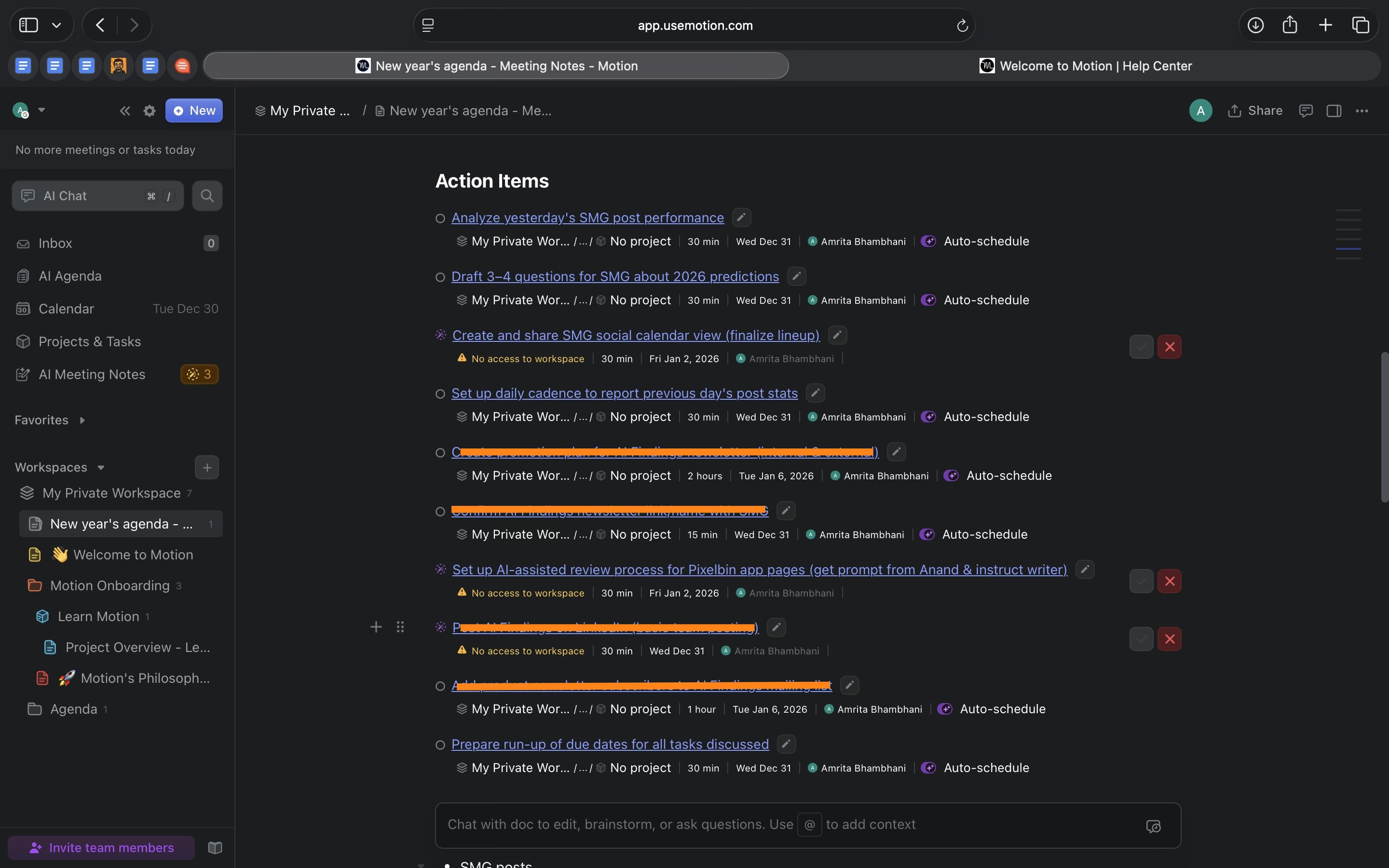 What made this compelling wasn’t the meeting recording itself. It was how accurately Motion understood the conversation. It picked up proper nouns, responsibilities, and timelines without prompting, and turned them into planned commitments.