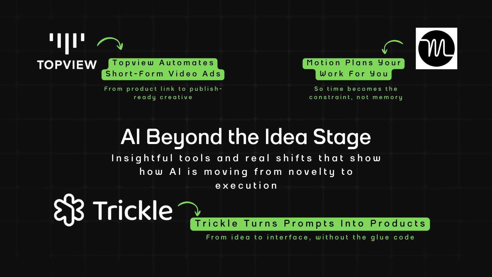 That’s it for this edition of AI Fyndings. With Motion structuring how work gets scheduled and followed through, Trickle turning ideas into product-shaped experiments, and Topview standardising how short-form ads are produced, this week highlighted a clear shift: AI is no longer just assisting work, it’s defining how execution happens.
