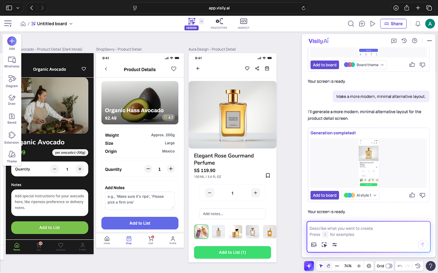 The prompt-to-screen feature is also more controlled than most alternatives. Instead of generating an entirely new style each time, Visily keeps to a predictable structure, which makes it easier to iterate without starting over. This is useful when you’re exploring variations rather than looking for an entire redesign.