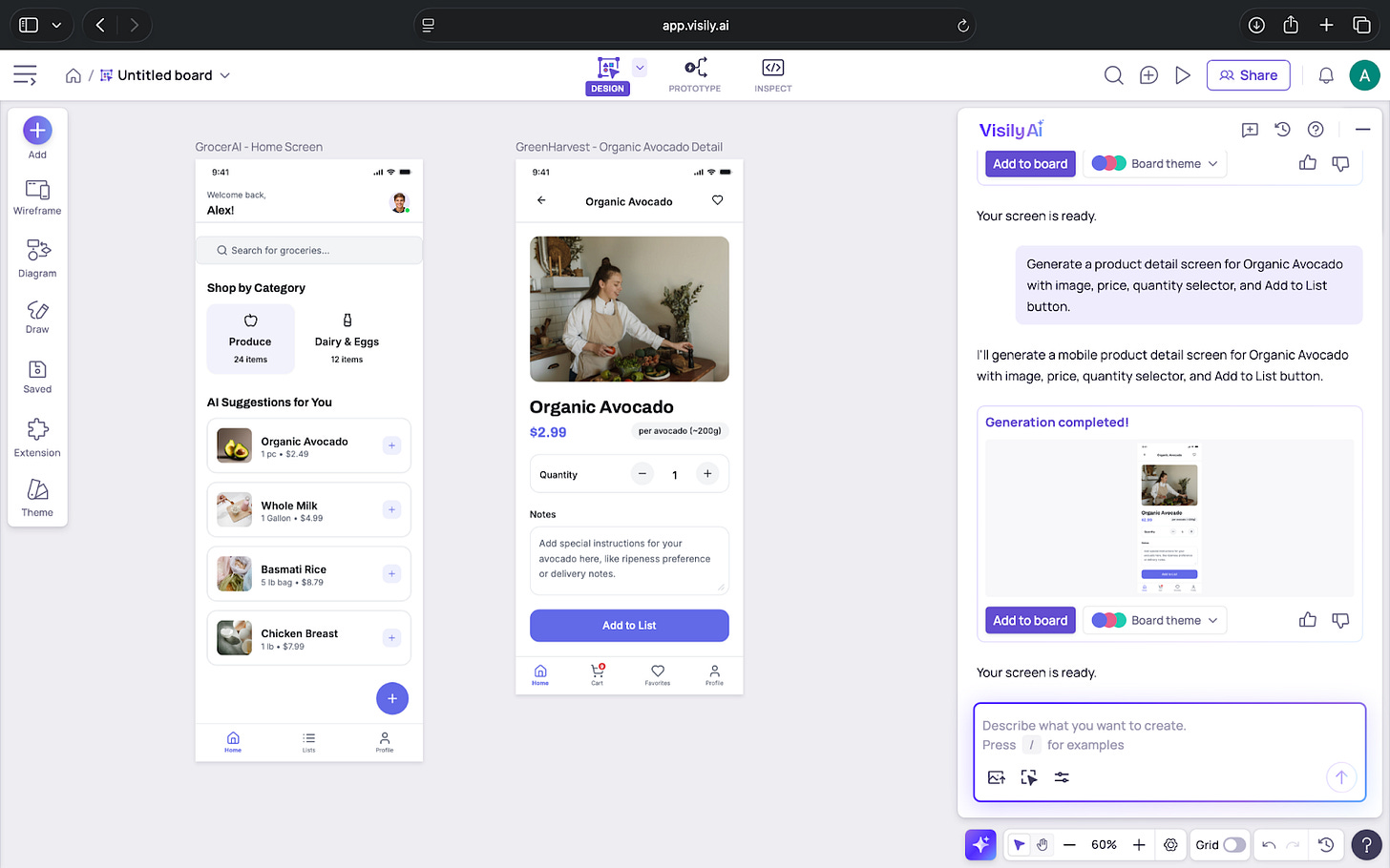 The most interesting part of Visily is how practical it feels. I tested it using the kind of prompts you normally say out loud in a meeting. A simple line like “grocery app home screen with product categories” generated a layout that looked like a baseline wireframe.