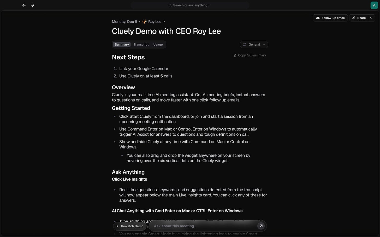 Cluely’s edge is that it is genuinely helpful during the call, not only after. You can ask questions, request a quick recap or get clarification in the middle of the conversation, which makes the tool feel genuinely useful in real time.